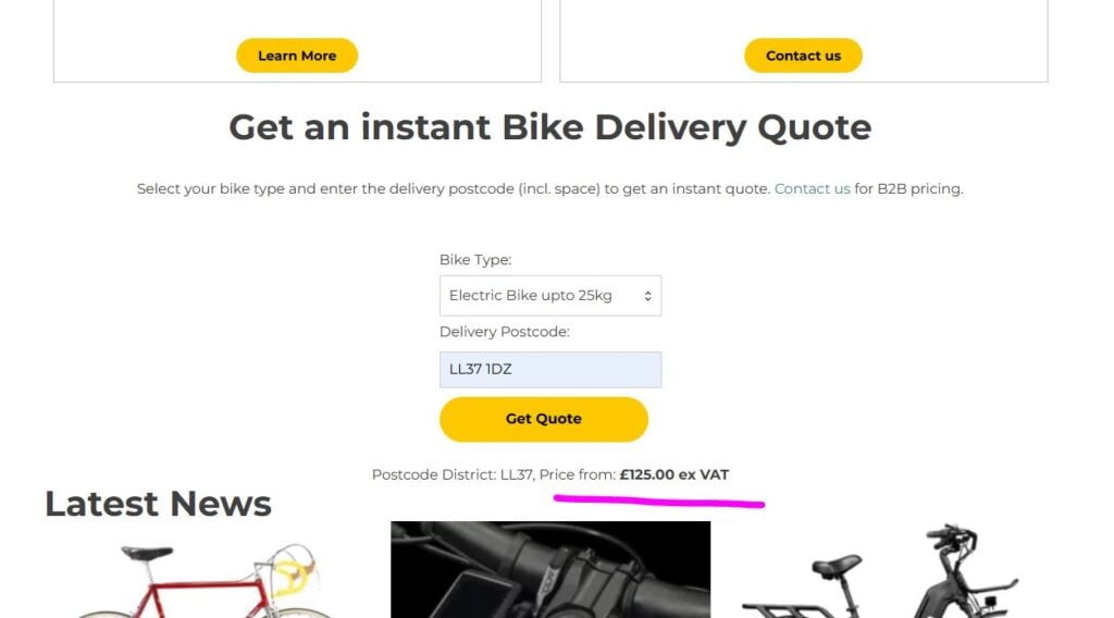 We’ve now launched our Quick Quote feature on the homepage. Customers simply select a bike type and a delivery postcode and hit the Get Quote button. An indicative price (ex VAT) will be instantly displayed.
